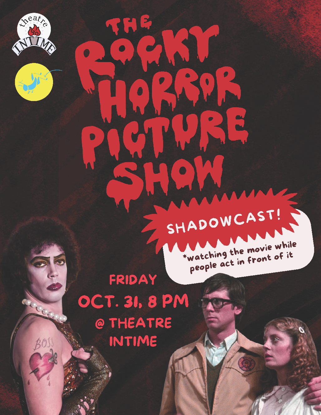 Give yourself over to absolute pleasure and come watch Theatre Intime’s screening of The Rocky Horror Picture Show! One night and one night only! We will be putting on our annual shadowcast of this cult-classic this Halloween (October 31st) at 8pm at Theater Intime (free and unticketed!), where we will stream the film as actors act it out on stage! I see you shiver with antici-pation, so make sure you don’t miss it!